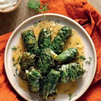 Ζεματίζουμε σε αλατισμένο νερό, σε δόσεις, τα μαρουλόφυλλα για 3 λεπτά. Τα στραγγίζουμε σε καθαρές πετσέτες και τα αφήνουμε να κρυώσουν. Σε ένα τηγάνι ζεσταίνουμετο ελαιόλαδο και σοτάρουμε το κρεμμύδι. Μόλις μαλακώσει, ρίχνουμε τα φρέσκα κρεμμυδάκια, το ρύζι και αλατοπιπερώνουμε. Ανακατεύουμε και προσθέτουμε τον πελτέ, τις λιαστές ντομάτες, τις μαύρες σταφίδες και τα κουκουνάρια. Αφήνουμε τη γέμιση να μαγειρευτεί για 1 λεπτό. Αποσύρουμε από τη φωτιά και ρίχνουμε τον άνηθο και το ξύσμα λεμονιού. Αφήνουμε κατά μέρος 3-4 ζεματισμένα μαρουλόφυλλα. Απλώνουμε ένα ένα τα υπόλοιπα μαρουλόφυλλα σε ένα ξύλο κοπής και κόβουμε τα κοτσάνια τους, τα οποία απλώνουμε στον πάτο της κατσαρόλας. Στο κέντρο κάθε ανοιγμένου φύλλου βάζουμε από 1 κ.σ. γέμιση και τυλίγουμε σε ντολμά. Βάζουμε τους ντολμάδες στριμωχτά, για να μην ανοίξουν, σε δύο στρώσεις μέσα στην κατσαρόλα. Τους καλύπτουμε με τα μαρουλόφυλλα που κρατήσαμε. Περιχύνουμε με 100 ml ελαιόλαδο και τον χυμό το λεμόνι. Ρίχνουμε 1 lt καυτό νερό και μαγειρεύουμε για 45 λεπτά.