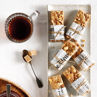 • Καταψύχουμε για 30 λεπτά. Κόβουμε σε μακρόστενα κομμάτια και τυλίγουμε κάθε τετράγωνο με λαδόκολλα. Διατηρούνται καλύτερα στο ψυγείο, λόγω του λαδιού καρύδας.