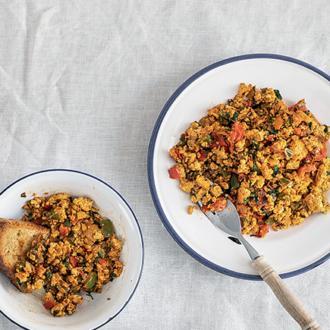 - Θρυμματίζουμε το τόφου στο τηγάνι, αλατοπιπερώνουμε και το σοτάρουμε για 1-2΄.