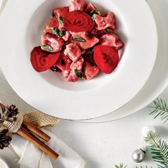 - Ενώνουμε τον πουρέ παντζαριών με τον πουρέ πατάτας και προσθέτουμε 1 πρέζα μοσχοκάρυδο. Ρίχνουμε λίγο λίγο το αλεύρι και ζυμώνουμε απαλά τη ζύμη μέχρι να γίνει λεία, αλλά να παραμένει ελαφρώς κολλώδης. Την πλάθουμε σε μπάλα και την αφήνουμε στην άκρη για λίγα λεπτά.