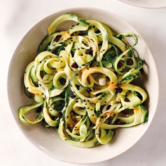 • Μοιράζουμε το αγγούρι και 1/2 φλ. φιστικοβούτυρο στα πιάτα, ανακατεύουμε και σκορπίζουμε από πάνω κρεμμυδάκια, σταφίδες και μαυροκούκι.