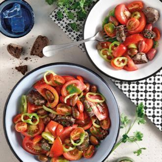 Ντομάτες και ντοματίνια με λάδι μαϊντανού, πιπεριά, μπουκιές χαρουπιού, ξύσμα πορτοκαλιού και ελιές
