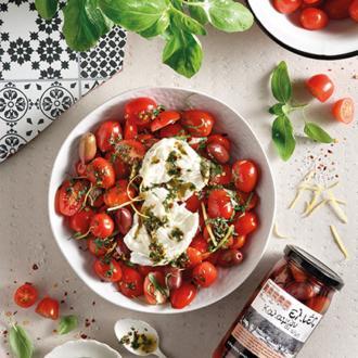 • Σε μπολ βάζουμε τα ντοματίνια, τα αλατίζουμε και τα περιχύνουμε με το υπόλοιπο ελαιόλαδο, ανακατεύουμε και προσθέτουμε τον υπόλοιπο βασιλικό χοντροκομμένο.