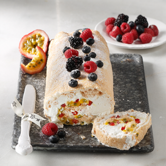 Πάβλοβα ρολό με γέμιση μους γιαουρτιού και συνοδεία φρούτων