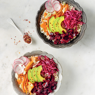 Σερβίρισμα: Μοιράζουμε το ρύζι σε δύο φαρδιά και ρηχά μπολ. Τοποθετούμε τα μαριναρισμένα παντζάρια και τους χυμούς τους. Στραγγίζουμε ξεχωριστά τα καρότα και το λάχανο και τα τοποθετούμε και αυτά πάνω στο ρύζι. Γαρνίρουμε με το αβοκάντο και το ραπανάκι κομμένο σε φέτες. Συμπληρώνουμε την υπόλοιπη σάλτσα, προσθέτοντας περισσότερο σησαμέλαιο, αν θέλουμε. Πασπαλίζουμε με μπούκοβο και σερβίρουμε με τα τσιπς kale στο πλάι (αν τα βάλουμε).