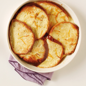 Βουτυρώνoυμε ένα πυρέξ και απλώνουμε μέσα 8 λεπτές φέτες από τσουρέκι, ακουμπώντας ελαφρώς τη μία πάνω στην άλλη. Χτυπάμε 15 γρ. ζάχαρη με 2 αβγά, ρίχνουμε 2 κ.σ. λικέρ πορτοκάλι και ανακατεύουμε.