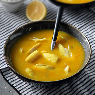 Ρίχνουμε στην κατσαρόλα το ελαιόλαδο, το σαφράν και σοτάρουμε τα λαχανικά για 5 λεπτά. Περιχύνουμε με το ζουμί που κρατήσαμε και βράζουμε για 20 λεπτά ή μέχρι να γίνουν. Αδειάζουμε το περιεχόμενο της κατσαρόλας στο μπλέντερ και το πολτοποιούμε μαζί με το λεμόνι. Δοκιμάζουμε και βελτιώνουμε τη γεύση στο αλατοπίπερο. Σερβίρουμε τη σούπα στα πιάτα, καθαρίζουμε το ψάρι και το μοιράζουμε την τελευταία στιγμή στη ζεστή σούπα.