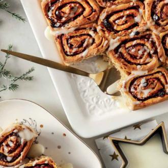 - Τοποθετούμε τα υλικά του γλάσου σε ένα μικρό μπολ, προσθέτοντας τελευταία τις 3 κ.σ. γάλα αμυγδάλου, 1 κουταλιά κάθε φορά, ανακατεύοντας για να σχηματιστεί ένα παχύ γλάσο. Περιχύνουμε το γλάσο ομοιόμορφα πάνω στα ρολά.