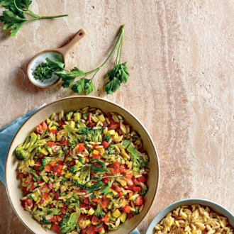 Βράζουμε 1 φλ. κριθαράκι (που μας περίσσεψε από το κριθαράκι με κιμά) σε άφθονο αλατισμένο νερό να μαγειρευτεί αλ ντέντε και το στραγγίζουμε. Κόβουμε σε λεπτά κυβάκια 1/2 κρεμμύδι, 1 κολοκυθάκι και 1 πιπεριά Φλωρίνης (από τα κεφτεδάκια με μπριάμ), 1 φουντίτσα ωμό μπρόκολο (από τα νιόκι), ψιλοκομμένο, και τα σοτάρουμε σε ένα τηγάνι με 2 κ.σ. ελαιόλαδο μέχρι να μαραθούν. Τα ανακατεύουμε με το στραγγισμένο κριθαράκι, 1 ντομάτα σε κυβάκια, 2-3 κ.σ. μαϊντανό ψιλοκομμένο, χυμό και ξύσμα από 1 λεμόνι και 2-3 κ.σ. ελαιόλαδο ακόμα. Σερβίρουμε τη σαλάτα χλιαρή ή κρύα.