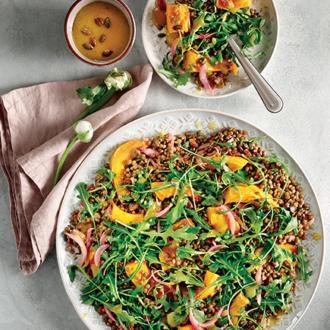 Σαλάτα με ψητή κολοκύθα, φακές και ντρέσινγκ ψητού λεμονιού