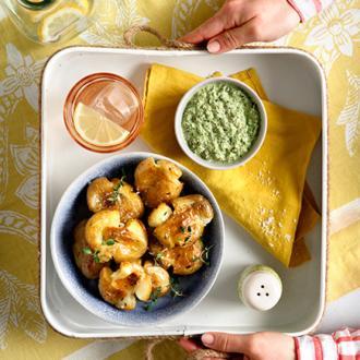 Τραγανές «σπασμένες» πατάτες με πικάντικη σάλτσα μυρωδικών, λεμόνι και κάππαρη