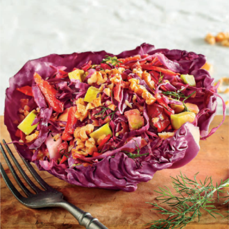 • Ψιλοκόβουμε το αβοκάντο, το προσθέτουμε στη σαλάτα και ανακατεύουμε ελαφρά. Σερβίρουμε μέσα σε «φωλιές» από τα εξωτερικά φύλλα του λάχανου που έχουμε κρατήσει και σερβίρουμε με περισσότερα ψιλοκομμένα καρύδια από πάνω!