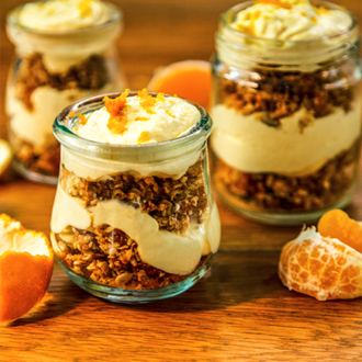 Για τη σύνθεση: Κόβουμε σε κομμάτια την γκρανόλα, ρίχνουμε λίγη από αυτή στον πάτο ενός ποτηριού, σκεπάζουμε με κρέμα, τοποθετούμε λίγη γκρανόλα από πάνω και καλύπτουμε με κρέμα εκ νέου.