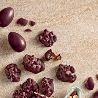 - Προθερμαίνουμε τον φούρνο στους 150°C, απλώνουμε 200 γρ. ξηρούς καρπούς (αμύγδαλο, φουντούκι, κ.λπ.) σε ταψάκι και τους καβουρντίζουμε στον προθερμασμένο φούρνο για 10 λεπτά. Σπάζουμε σε κομματάκια 200 γρ. μαύρη σοκολάτα από το περίσσευμα των σοκολατένιων αβγών και βάζουμε την περισσότερη από αυτή να λιώσει σε μπεν μαρί, ανακατεύοντας συχνά με μαρίζ. Κατεβάζουμε το μπολ με τη λιωμένη σοκολάτα από το μπεν μαρί και ενσωματώνουμε πρώτα τη σοκολάτα που κρατήσαμε για να πέσει η θερμοκρασία της και μετά τους καβουρντισμένους ξηρούς καρπούς. Παίρνουμε κουταλιές από το μείγμα και τις τοποθετούμε μία μία πάνω σε λαδόκολλα, αφήνοντας απόσταση μεταξύ τους. Αφήνουμε τα βραχάκια να κρυώσουν εντελώς και να σταθεροποιηθούν πριν τα μεταφέρουμε σε φοντανιέρα!και τα λαχανικά και πασπαλίζουμε με 1 φλ. τριμμένα κίτρινα τυριά. Σκεπάζουμε