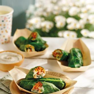 • Βάζουμε στο κέντρο κάθε φύλλου λίγο χούμους, καρότο, πιπεριές, αβοκάντο και λίγη από τη σος και διπλώνουμε προς τα μέσα τα άκρα του φύλλου, σαν να τυλίγουμε ντολμά. Τα παγώνουμε για τουλάχιστον 30 λεπτά, τα βάζουμε σε ατομικές συσκευασίες και γαρνίρουμε με το υπόλοιπο χούμους.