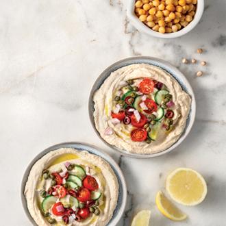 Πολτοποιούμε στο μπλέντερ τα ρεβίθια μαζί με το σκόρδο, το ταχίνι, τον χυμό λεμονιού, το κύμινο και λίγο από τον ζωμό των ρεβιθιών. Δοκιμάζουμε για επιπλέον αλάτι και πιπέρι και τα σερβίρουμε σε βαθύ πιάτο, παρέα με 2-3 ντοματίνια κομμένα σε φέτες, φετούλες από αγγούρι, κάππαρη, ελιές αποπυρηνωμένες, ροδέλες από κρεμμύδι (κάτι σαν χωριάτικη σαλάτα) και λίγο ελαιόλαδο.
