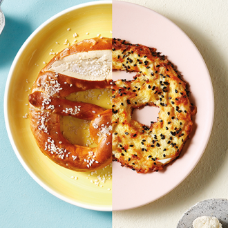 Προθερμαίνουμε τον φούρνο στους 220°C και στρώνουμε το ταψί του φούρνου με αντικολλητικό χαρτί. Σε κατσαρόλα με νερό που βράζει ρίχνουμε 6 φλ. κουνουπίδι, σε μπουκετάκια, να μαλακώσουν για περίπου 8 λεπτά. Σουρώνουμε, τα αφήνουμε να κρυώσουν ελαφρώς και τα ψιλοκόβουμε στο μούλτι. Τα αδειάζουμε σε καθαρή βαμβακερή πετσέτα να στραγγίξουν τα πολλά υγρά του και τα ρίχνουμε σε μπολ. Προσθέτουμε 1 μεγάλο αβγό, ελαφρώς χτυπημένο, 1 κ.γ. μείγμα αποξηραμένων λαχανικών και 1 φλ. τυρί κίτρινο (π.χ. κασέρι), τριμμένο. Ανακατεύουμε καλά και μοιράζουμε το μείγμα σε 6 μερίδες πάνω στο ταψί, σχηματίζοντας κύκλους με διάμετρο περίπου 9 εκ. Ανοίγουμε 3 μικρές τρύπες σε κάθε δίσκο προσπαθώντας να δώσουμε στη «ζύμη» το σχήμα των pretzels με τη βοήθεια των δαχτύλων μας. Πασπαλίζουμε με αλάτι και 2 κ.γ. σουσάμι. Ψήνουμε μέχρι να ροδίσουν και να γίνουν τραγανά γύρω από τις άκρες, για περίπου 22-25 λεπτά.