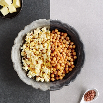 Ξεχνάμε για λίγο τα κλασικά ποπ κορν και δοκιμάζουμε αυ- τή την πανεύκολη και απείρως νοστιμότερη συνταγή με τα παρεξηγημένα ρεβίθια, που μετατρέπονται σε ένα άκρως ενδιαφέρον και πολύ υγιεινό σνακ. Μουλιάζουμε αποβραδίς 500 γρ. ρεβίθια σε βραστό νερό, μαζί με 1 κ.σ. αλάτι. Την επομένη, τα ξεπλένουμε, τα στεγνώ- νουμε και τα χωρίζουμε σε 4 μερίδες των 125 γρ. η καθεμία. Σε αντικολλητικό τηγάνι ζεσταίνουμε 2-3 κ.σ. ελαιόλαδο σε μέτρια φωτιά και καβουρδίζουμε τη μία μερίδα, μέχρι να πάρει χρυσαφένιο χρώμα. Στραγγίζουμε σε χαρτί κουζίνας, αφήνουμε στην άκρη και συνεχίζουμε με τον ίδιο τρόπο με τις υπόλοιπες 3 δόσεις,
