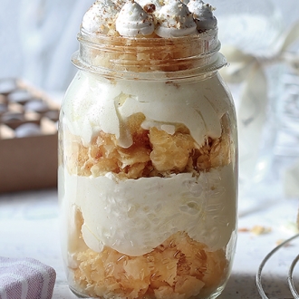 “ – Με ένα σύρμα χειρός χτυπάμε τους κρόκους με το αυγό, τη μισή περίπου ζάχαρη και το κορν φλάουρ, μέχρι να σχηματίσουν ένα ομογενές μείγμα. – Βράζουμε το γάλα μαζί με 100 γρ. κρέμα γάλακτος, τη βανίλια, το ξύσμα λεμονιού και την υπόλοιπη ζάχαρη. Τα προσθέτουμε σιγά-σιγά στο μείγμα των κρόκων, ανακατεύοντας συνεχώς με σύρμα χειρός, έτσι ώστε να ανεβάσουν θερμοκρασία όλα τα υλικά. – Περνάμε το μείγμα από ψιλό σουρωτήρι και το ξαναρίχνουμε στην κατσαρόλα. Βράζουμε σε ήπια φωτιά μέχρι να πήξει, συν 1 λεπτό επιπλέον. Κατά τη διάρκεια του βρασμού ανακατεύουμε ζωηρά με σύρμα χειρός, ξύνοντας κάθε