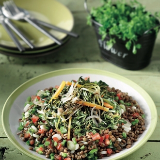 • Σε μια κατσαρόλα ζεσταίνουμε το ξίδι με το νερό, τη ζάχαρη και το αλάτι. Όταν αρχίσει να βράζει, ρίχνουμε μέσα το σταμναγκάθι και το τραβάμε με πιρούνι αμέσως για να μην ψηθεί. Το ξεπλένουμε και το αφήνουμε στην άκρη να στραγγίξει. • Μέσα στο νερόξιδο που βράζει, ρίχνουμε το μαραθόσπορο, το γλυκάνισο και αποσύρουμε από την φωτιά. • Χωρίζουμε τα φύλλα του κρεμμυδιού και τα ρίχνουμε μέσα στην κατσαρόλα μαζί με τα καρότα, τον άνηθο και το μάραθο. Αφήνουμε το μείγμα να κρυώσει. • Τότε ρίχνουμε μέσα το σταμναγκάθι, ανακατεύουμε και τα αφήνουμε για 2 -3 μέρες, να μαριναριστούν και να πάρουν τα αρώματα. • Σε κατσαρόλα με βραστό νερό ζεματίζουμε τις φακές για 1-2’ και τις ξεπλένουμε. • Τις ξαναρίχνουμε στην κατσαρόλα με κρύο νερό και τη δάφνη, τις φλούδες πορτοκαλιού και το σκόρδο και τις βράζουμε, φροντίζοντας να μην παραβράσουν. Όταν είναι έτοιμες, πετάμε τη δάφνη, τις φλούδες πορτοκαλιού και το σκόρδο, τις στραγγίζουμε και τις αφήνουμε να κρυώσουν. • Βάζουμε σε ένα μπολ το φρέσκο κρεμμύδι, το μαϊντανό, την πιπεριά και τη τομάτατομάτα, τις φακές και ανακατεύουμε. • Περιχύνουμε με το ελαιόλαδο, το ξίδι, αλατοπιπερώνουμε και ανακατεύουμε. • Σερβίρουμε στο κέντρο του πιάτου τα τουρσιά, τις φακές γύρω- γύρω και ραντίζουμε με ελαιόλαδο.