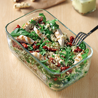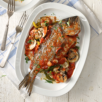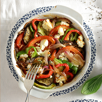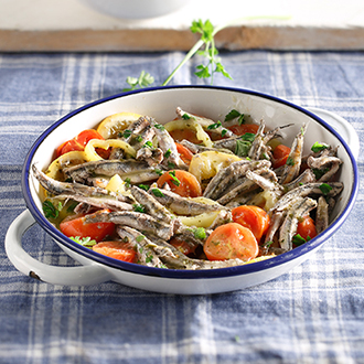 Σουρώνουμε τα ρεβίθια που έχουμε μουσκέψει και τα ρίχνουμε σε μια βαθιά κατσαρόλα. Τα σκεπάζουμε με άφθονο νερό και τα βράζουμε σε δυνατή φωτιά. Μόλις πάρουν βράση, χαμηλώνουμε τη φωτιά και τα σιγοβράζουμε για 45 - 50 λεπτά ή μέχρι να μαλακώσουν. Τα σουρώνουμε και τα αφήνουμε στην άκρη. Σε ένα αντικολλητικό τηγάνι σοτάρουμε τα λουκάνικα με το μισό ελαιόλαδο, ανακατεύοντας μέχρι να ροδίσουν και τα βάζουμε σε ένα πιάτο. Στο ίδιο λάδι σοτάρουμε το κρεμμύδι για 2-3 λεπτά και σβήνουμε με το κρασί. Το αφήνουμε να εξατμιστεί. Προθερμαίνουμε τον φούρνο στους 180° C. Βάζουμε σε μια γάστρα τα ρεβίθια, τα κομμάτια λουκάνικου, το κρεμμύδι, το υπόλοιπο ελαιόλαδο, τις πιπεριές, το μπούκοβο, αλάτι, πιπέρι και το ζεστό νερό. Σκεπάζουμε και ψήνουμε για 35-40 λεπτά. Βγάζουμε τη γάστρα από τον φούρνο, προσθέτουμε τα ντοματίνια, λίγο ζεστό νερό, αν χρειάζεται, και συνεχίζουμε το ψήσιμο για 10-15 λεπτά ακόμα.