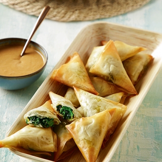 Γέμιση: Σοτάρουμε τα κρεμμυδάκια στο ελαιόλαδο για 5 λεπτά, πασπαλίζουμε με το μοσχοκάρυδο και προσθέτουμε τα χόρτα. Συνεχίζουμε το σοτάρισμα μέχρι να μαραθούν ελαφρώς. Αποσύρουμε από τη φωτιά, προσθέτουμε αλάτι, πιπέρι, τα αρωματικά και το φιστικοβούτυρο. Ανακατεύουμε και αφήνουμε να κρυώσουν εντελώς. Πιτάκια: Βάζουμε ένα φύλλο πάνω στον πάγκο εργασίας, το αλείφουμε με ελαιόλαδο, σκεπάζουμε με άλλο ένα φύλλο, το οποίο λαδώνουμε επίσης και με ένα κοφτερό μαχαίρι τα κόβουμε σε 5 (διπλές) λωρίδες. Στην κάτω δεξιά γωνία της πρώτης λωρίδας βάζουμε μια κουταλιά από τη γέμιση και ξεκινάμε να διπλώνουμε το φύλλο, ώστε να σχηματίσουμε τρίγωνο. Συνεχίζουμε με τα υπόλοιπα υλικά.