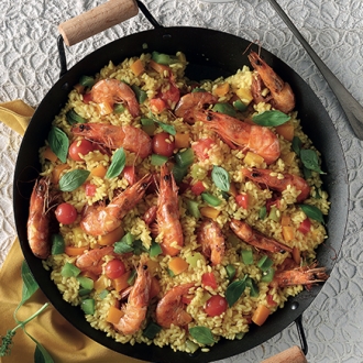 • Βάζουμε μια φαρδιά και ρηχή, αντικολλητική κατσαρόλα σε δυνατή φωτιά, ρίχνουµε το ελαιόλαδο και ροδίζουμε τις γαρίδες. Τις βγάζουμε σε πιάτο, πασπαλίζουμε με το ξύσμα λεμονιού, περιχύνουμε με 2 κ. σ. από το ζωμό και αφήνουμε στην άκρη. • Χαμηλώνουμε τη φωτιά σε μέτρια θερμοκρασία και σοτάρουμε το κρεµμύδι και το σκόρδο, με το αλάτι, τον κουρκου-µά, την πάπρικα και το πιπέρι, για περίπου 5’. • Σβήνουµε µε το κρασί, προσθέτουµε τις πιπεριές, τα ντοματίνια και το ρύζι. Ρίχνουµε και το ζωμό και ανακατεύουµε. • Τα αφήνουµε να σιγοβράσουν σε χαµηλή φωτιά, με ξεσκέπαστη την κατσαρόλα, µέχρι να µαλακώσει το ρύζι, για περίπου 20’, χωρίς να ανακατεύουμε. Προσθέτουμε τις γαρίδες, με το ξύσμα και το ζωμό, τακτοποιώντας τις ανάμεσα στο ρύζι. Σβήνουµε τη φωτιά, σκεπάζουµε την κατσαρόλα µε πετσέτα και αφήνουµε για 10’. • Σερβίρουμε γαρνίροντας με φρέσκα φύλλα βασιλικού.