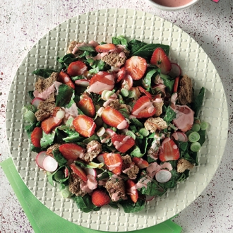 • Βάζουμε στο μπλέντερ τα υλικά για το ντρέσινγκ γιαουρτιού και τα πολτοποιούμε μέχρι να δημιουργηθεί μια σάλτσα λεία και πυκνή. Αδειάζουμε τη σάλτσα σε ένα μπολ, τη σκεπάζουμε και τη φυλάμε στο ψυγείο μέχρι το σερβίρισμα. • Σε ένα φαρδύ μπολ βάζουμε όλα τα υλικά για τη σαλάτα εκτός από την κρέμα βαλσαμικού και ανακατεύουμε καλά. • Προσθέτουμε το ντρέσινγκ και ανακατεύουμε καλά. Ραντίζουμε με την κρέμα βαλσάμικου και σερβίρουμε αμέσως.