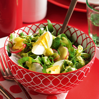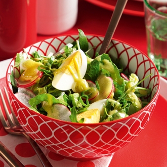 Βάζουμε όλα τα λαχανικά σε μια ευρύχωρη λεκάνη, προσθέτουμε αλάτι, πιπέρι, το ελαιόλαδο, τον χυμό λεμονιού και τη μουστάρδα και ανακατεύουμε πολύ καλά. Μεταφέρουμε τα σαλατικά σε πιατέλα, σκορπίζουμε από πάνω τα αβγά, αλατοπιπερώνουμε και σερβίρουμε