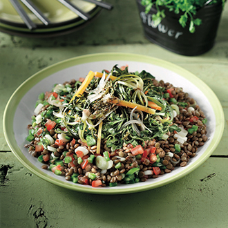 • Σε μια κατσαρόλα ζεσταίνουμε το ξίδι με το νερό, τη ζάχαρη και το αλάτι. Όταν αρχίσει να βράζει, ρίχνουμε μέσα το σταμναγκάθι και το τραβάμε με πιρούνι αμέσως για να μην ψηθεί. Το ξεπλένουμε και το αφήνουμε στην άκρη να στραγγίξει. • Μέσα στο νερόξιδο που βράζει, ρίχνουμε το μαραθόσπορο, το γλυκάνισο και αποσύρουμε από την φωτιά. • Χωρίζουμε τα φύλλα του κρεμμυδιού και τα ρίχνουμε μέσα στην κατσαρόλα μαζί με τα καρότα, τον άνηθο και το μάραθο. Αφήνουμε το μείγμα να κρυώσει. • Τότε ρίχνουμε μέσα το σταμναγκάθι, ανακατεύουμε και τα αφήνουμε για 2 -3 μέρες, να μαριναριστούν και να πάρουν τα αρώματα. • Σε κατσαρόλα με βραστό νερό ζεματίζουμε τις φακές για 1-2’ και τις ξεπλένουμε. • Τις ξαναρίχνουμε στην κατσαρόλα με κρύο νερό και τη δάφνη, τις φλούδες πορτοκαλιού και το σκόρδο και τις βράζουμε, φροντίζοντας να μην παραβράσουν. Όταν είναι έτοιμες, πετάμε τη δάφνη, τις φλούδες πορτοκαλιού και το σκόρδο, τις στραγγίζουμε και τις αφήνουμε να κρυώσουν. • Βάζουμε σε ένα μπολ το φρέσκο κρεμμύδι, το μαϊντανό, την πιπεριά και τη τομάτατομάτα, τις φακές και ανακατεύουμε. • Περιχύνουμε με το ελαιόλαδο, το ξίδι, αλατοπιπερώνουμε και ανακατεύουμε. • Σερβίρουμε στο κέντρο του πιάτου τα τουρσιά, τις φακές γύρω- γύρω και ραντίζουμε με ελαιόλαδο.