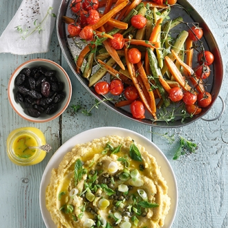 “ Φάβα: Σε μια μέτρια κατσαρόλα βάζουμε τη φάβα με το νερό να βράσει. Όταν πάρει βράση, χαμηλώνουμε την φωτιά και ξαφρίζουμε με μια κουτάλα για 3-4 λεπτά. Στη συνέχεια ρίχνουμε το κρεμμύδι ολόκληρο, σκεπάζουμε την κατσαρόλα και σιγοβράζουμε για περίπου 1 ώρα ή μέχρι να χυλώσει και να έχει απορροφήσει όλο το νερό. Λαχανικά: Εν τω μεταξύ, ανακατεύουμε όλα τα υλικά, αλατοπιπερώνουμε, τα στρώνουμε σε ένα ταψί σε μία στρώση και ψήνουμε στους 170° C για 25 λεπτά. Αφαιρούμε τα αρωματικά και τα πετάμε. Λαδολέμονο: Χτυπάμε όλα τα υλικά στο μπλέντερ και κρατάμε το λαδολέμονο σε βαζάκι στο ψυγείο,