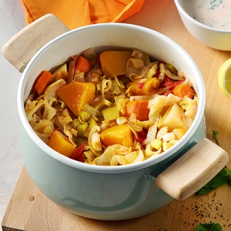 Ζεσταίνουμε το ελαιόλαδο σε μέτρια φωτιά και αχνίζουμε το κρεμμύδι, το πράσο και το σκόρδο για 15 λεπτά. Ενδιάμεσα αλατίζουμε. Προσθέτουμε όλα τα λαχανικά (λάχανο, κολοκύθα, πατάτες, καρότα). Αλατίζουμε πάλι λίγο και αχνίζουμε για 3-4 λεπτά. Περιχύνουμε με την ντομάτα και συμπληρώνουμε 1 φλ. ζεστό νερό. Μόλις πάρουν όλα μια καλή βράση, ρίχνουμε το ούζο, χαμηλώνουμε τη φωτιά, σκεπάζουμε και μαγειρεύουμε για περίπου 20 λεπτά, μέχρι να γίνουν τα λαχανικά. Στα μισά του χρόνου ελέγχουμε αν χρειάζεται να συμπληρώσουμε λίγο νερό και ρίχνουμε το τζίντζερ. Όταν το φαγητό είναι έτοιμο, περιχύνουμε με το υπόλοιπο ελαιόλαδο, τραβάμε την κατσαρόλα από τη φωτιά και αφήνουμε για 5 λεπτά. Πασπαλίζουμε με φρεσκοτριμμένο πιπέρι. Ανακατεύουμε το γιαούρτι με τα φύλλα του δυόσμου, το ξύσμα και τον χυμό λεμονιού και όσο ζουμί μπορούμε να βγάλουμε από το φαγητό. Περιχύνουμε με αυτό το μείγμα το φαγητό μας και σερβίρουμε αμέσως.