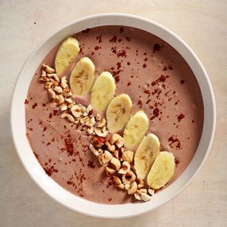 Σε ένα μπλέντερ πολτοποιούμε όλα τα υλικά για το smoothie μέχρι να έχουμε ένα κρεμώδες αποτέλεσμα. Αδειάζουμε το μείγμα σε μπολ, καλύπτουμε με την μπανάνα, τα φουντούκια, πασπαλίζουμε με το κακάο και σερβίρουμε αμέσως. TIP Μπορούμε να βάλουμε από την προηγουμένη τις μπανάνες στην κατάψυξη, κομμένες σε φετάκια, ώστε να είναι έτοιμες την επομένη για το smoothie.