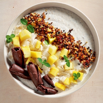 Smoothie: Ανακατεύουμε τις νιφάδες βρόμης με το μισό γάλα καρύδας, τους σπόρους chia, τη βανίλια και το αλάτι σε ένα μικρό μπολ. Το καλύπτουμε με μεμβράνη και το βάζουμε στο ψυγείο για 30 λεπτά‘ μέχρι να φτιάξουμε το μείγμα δημητριακών. Μείγμα τραγανών δημητριακών: Προθερμαίνουμε τον φούρνο στους 170° C. Σε ένα μπολ ανακατεύουμε καλά όλα τα υλικά και τα μοιράζουμε σε δύο λαμαρίνες φούρνου στρωμένες με λαδόκολλα. Στρώνουμε το μείγμα όσο πιο ομοιόμορφα γίνεται και ψήνουμε στο φούρνο για περίπου 30 λεπτά‘, ανακατεύοντας ενδιάμεσα κάθε 15 λεπτά‘, μέχρι να καβουρντιστεί ελαφρώς. Βγάζουμε από τον φούρνο και αφήνουμε το μείγμα να κρυώσει. Στη συνέχεια παίρνουμε το μείγμα για το smoothie από το ψυγείο και το χτυπάμε στο μπλέντερ μαζί με το υπόλοιπο γάλα καρύδας και την μπανάνα μέχρι να γίνει ένα αφράτο, λείο αποτέλεσμα. Το αδειάζουμε σε ένα μπολ, βάζουμε από πάνω 2 κ.σ. από το μείγμα τραγανών δημητριακών και καλύπτουμε με το μάνγκο, τις φλούδες σοκολάτας, τις νιφάδες καρύδας και τα φύλλα μέντας και σερβίρουμε. Το υπόλοιπο μείγμα δημητριακών το αφήνουμε να κρυώσει καλά και το αποθηκεύουμε σε βάζο, για επόμενες χρήσεις.