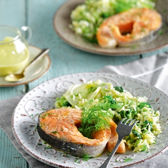 Κόβουμε σε μεγάλα κομμάτια τα φιλέτα ψαριού, τα αλατίζουμε και τα αφήνουμε στο ψυγείο μέχρι να τα χρησιμοποιήσουμε. Σάλτσα: Χτυπάμε τα υλικά της σάλτσας για 2 λεπτά στο μπλέντερ και την αφήνουμε στην άκρη. Ρυζοσαλάτα: Σε μια μέτρια κατσαρόλα βράζουμε το νερό με το αλάτι και τη δάφνη και όταν αρχίσει να κοχλάζει, ρίχνουμε το ρύζι. Χαμηλώνουμε τη φωτιά και σιγοβράζουμε με μισόκλειστο καπάκι μέχρι να γίνει το ρύζι. Το σουρώνουμε και το ξεπλένουμε με κρύο νερό. Το αφήνουμε να στραγγίσει και το αδειάζουμε σε ένα μεγάλο μπολ. Ρίχνουμε μέσα τα λαχανικά και τα 2/3 της σάλτσας, ανακατεύουμε, σκεπάζουμε με διάφανη μεμβράνη και αφήνουμε τη σαλάτα στο ψυγείο μέχρι να τη σερβίρουμε. Διατηρείτε έως 2 μέρες. Ψάρι: Προθερμαίνουμε τον φούρνο στους 180° C. Παίρνουμε ένα μεγάλο ταψί που να χωράνε ακριβώς τα φιλέτα, τα λαδώνουμε καλά και τα ψήνουμε για 5-8 λεπτά ανάλογα με το πάχος. Βγάζουμε από τον φούρνο, περιχύνουμε με την υπόλοιπη σάλτσα και σερβίρουμε με τη ρυζοσαλάτα, δροσερή από το ψυγείο ή σε θερμοκρασία δωματίου. TIPS • Μπορούμε να χρησιμοποιήσουμε οποιαδήποτε λαχανικά εποχής, ωμά και ψιλοκομμένα ή βρασμένα στον ατμό για 2-3 λεπτά. Επίσης, ταιριάζει πολύ η κάππαρη ή οι πράσινες ελιές, ψιλοκομμένες. Αλλά και ο βασιλικός, με κυβάκια ντομάτας και ελιές μαύρες. • Μπορούμε να αντικαταστήσουμε το ψάρι με αμύγδαλα καβουρντισμένα και μανιτάρια ή να κάνουμε τη ρυζοσαλάτα ακόμα πιο πλούσια σε λαχανικά. Το μυστικό στη ρυζοσαλάτα είναι το λεμόνι!