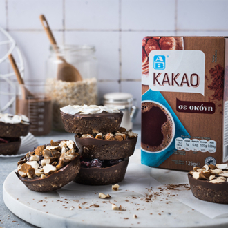 Αυτά τα γλυκά cups γίνονται στη στιγμή με υλικά φιλικά προς το περιβάλλον. Επέλεξα βρόμη, ωμή αμυγδαλόψιχα ελληνικής προέλευσης ΑΒ Authentic Nuts, φυτικό βούτυρο ξηρών καρπών χωρίς πρόσθετα, βιολογικό έλαιο καρύδας και ΑΒ Κακάο σε σκόνη, το οποίο η ΑΒ έχει αγοράσει από φάρμες πιστοποιημένες από τη Rainforest Alliance™ υποστηρίζοντας έτσι τις βιώσιμες καλλιέργειες κακάο. Για γλυκαντικό μπορείς να χρησιμοποιήσεις σιρόπι σφενδάμου ή αγαύης για τη vegan εκδοχή τους ή ένα ελαφρύ μέλι.