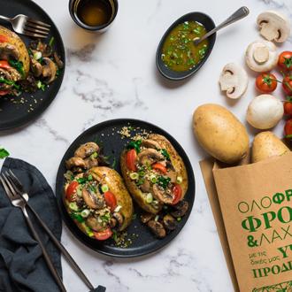 Για τις ψητές γεμιστές πατάτες με σκορδάτα μανιτάρια με σπανάκι και κινόα θα χρειαστούμε: