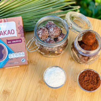 - Σε ένα πιάτο προσθέτουμε ινδική καρύδα τριμμένη και σε ένα άλλο σκόνη κακάο. Περνάμε τα μπαλάκια μας σε ένα από τα δύο πιάτα. Μπορούμε να τα αφήσουμε και σκέτα χωρίς επικάλυψη