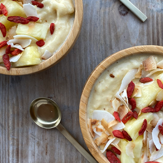 Μόλις είναι έτοιμο, μεταφέρουμε σε ένα μπολ και στολίζουμε με κομμάτια φρέσκου ανανά, flakes καρύδας, goji berries, σπόρους chia ή ό,τι άλλο προτιμάς.