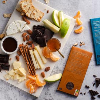 Διάλεξε dark σοκολάτες που συμπληρώνουν ιδανικά τα τυριά. Προτείνω από τη σειρά Original Happiness, τη μαύρη σοκολάτα με 64% κακάο από το Περού & τη μαύρη σοκολάτα με 72% κακάο από την Τανζανία με εκλεκτικές, ραφινάτες, έντονες γεύσεις για τους καθαρούς λάτρεις της σοκολάτας, όπου κάθε δαγκωνιά σε ταξιδεύει σε εξωτικές χώρες, εκεί όπου ο ήλιος, η γη και το μικροκλίμα, κάνουν κάθε κακάο μοναδικό.
