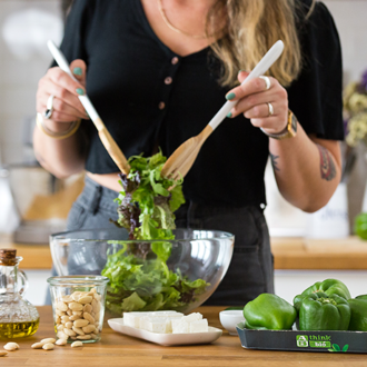 Τα λαχανικά και τα φρούτα μπορεί να μας δίνουν βιταμίνες και φυτικές ίνες, τι κάνουμε όμως με τα καλά λιπαρά, τις πρωτεΐνες και τους υδατάνθρακες που χρειάζεται ένα γεύμα για να είναι ολοκληρωμένο; Εμπλούτισε τις σαλάτες με αβοκάντο ή ξηρούς καρπούς για τα απαραίτητα ακόρεστα λιπαρά, βάλε διάφορα τυριά, βραστά αυγά ή διατροφική μαγιά που θα βρεις στο τμήμα ΑΡΜΟΝΙΑ των καταστημάτων ΑΒ Βασιλόπουλος για την απαραίτητη πρωτεΐνη και προτίμησε παξιμάδια ή κριτσίνια ολικής άλεσης για υδατάνθρακες και επιπλέον φυτικές ίνες.