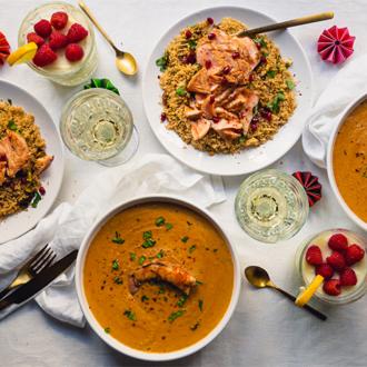 Ποιος είπε ότι για να ετοιμάσεις το δείπνο για το ρεβεγιόν πρέπει να κλειστείς στην κουζίνα με τις ώρες και να λιώσεις από το άγχος; Φέτος, #allazoumesinithies και ετοιμάζουμε ένα γιορτινό δείπνο με θαλασσινά που θα εντυπωσιάσει τους καλεσμένους και ετοιμάζεται πολύ άνετα. Για ορεκτικό, μια bisque από γαρίδες, που ακούγεται “ψαρωτική” αλλά στην πραγματικότητα ετοιμάζεται αρκετά εύκολα. Για κυρίως, σολομό με ρόδι και κους κους με σταφίδες και ξηρούς καρπούς, που γίνεται μέσα σε 15 λεπτά. Ενώ για επιδόρπιο, μια πανεύκολη κρέμα λεμονιού για να ξεπλύνει τη γεύση από το ψάρι και να σου αφήσει χώρο για τη βασιλόπιτα. Και το καλύτερο; Το πρώτο πιάτο και το επιδόρπιο θα τα ετοιμάσεις από την προηγούμενη μέρα με την ησυχία σου. Έτσι, το μόνο που έχεις να κάνεις την ημέρα της παραμονής, είναι να ζεστάνεις την bisque, να ασχοληθείς για 15 λεπτά με το κυρίως και φυσικά να ετοιμαστείς για μια όμορφη βραδιά με τους αγαπημένους σου ανθρώπους.
